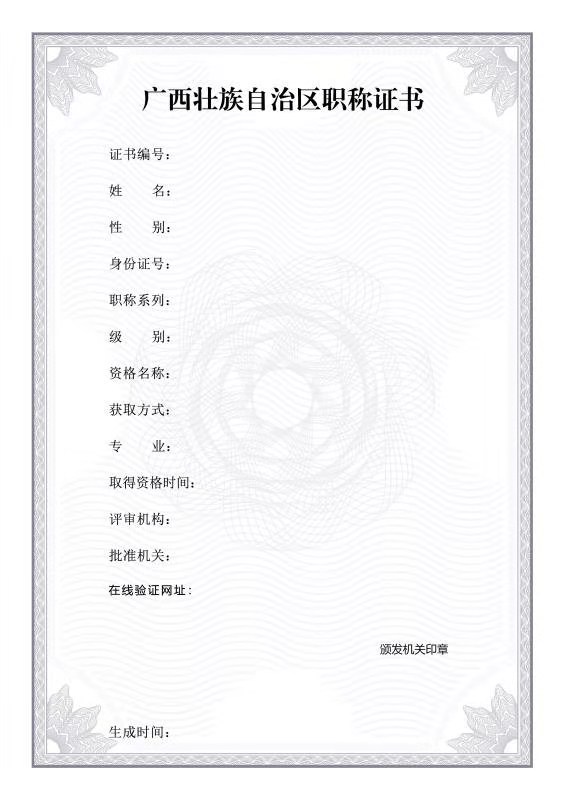 由于电子证书具有可复制和不可回收性,职称资格的有效性以电子证照库数据和取得资格文件为准。有关单位或个人可通过广西壮族自治区人力资源和社会保障厅电子证照库核验证书的真实性和有效性。