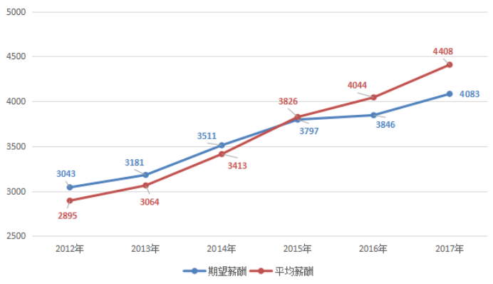 近六年求职者期望平均薪酬和用人单位发布职位的平均薪酬对比走势图如下: