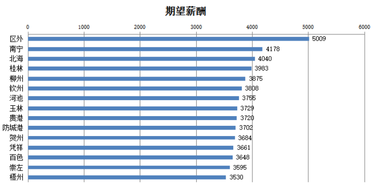 广西人才网联系统中区内意向工作地在各市对应的求职者期望薪酬水平分布图如下(单位:元/月):
