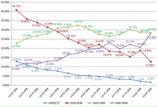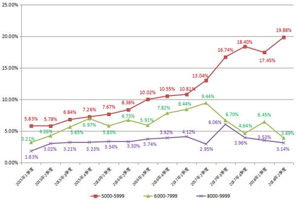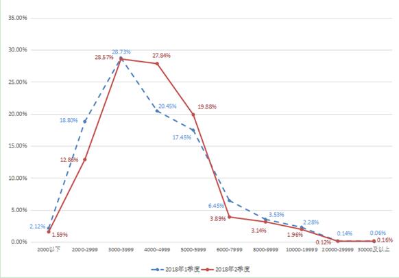 由上图可见,5000-5999/月区间的职位数量占比回升较为明显,2018年第二季度占比达到19.88%,环比增长2.43个百分比;而6000-7999/月区间的职位数量占比本季度出现小幅下滑,下降至3.89%;8000-9999/月区间的职位数量在2018年第二季度出现微跌,占比为3.14%,环比减少0.39个百分点。