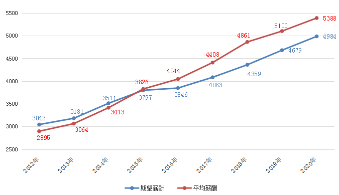 近九年求职者期望平均薪酬和用人单位发布职位的平均薪酬对比走势图如下: