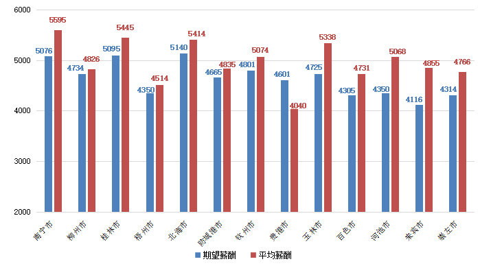 广西人才网中各工作地对应的求职者期望薪酬和职位平均薪酬如下图(单位:元/月):
