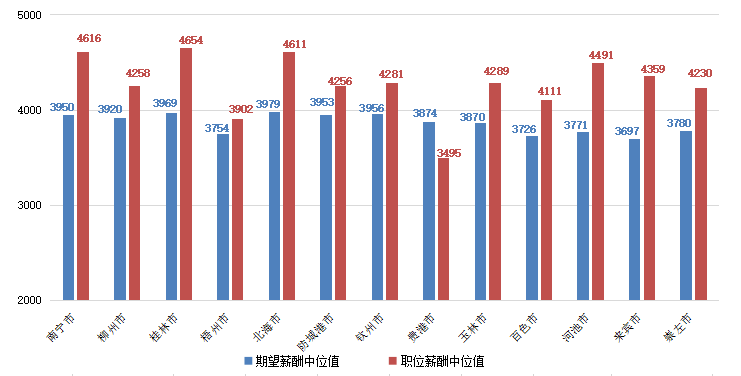 广西人才网中各工作地对应的求职者期望薪酬和职位薪酬中位值如下表(单位:元/月):