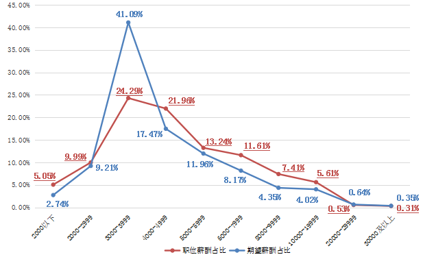 2020年求职者期望与职位薪酬(各薪酬区间分布)对比曲线图: