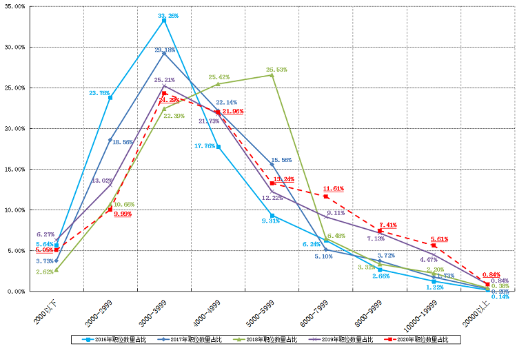 如上图所示,近五年来曲线后移,职位平均薪酬水平呈现逐年增长趋势,平均薪酬水平已由2016年的4044元/月增长为本年度的5388元/月,涨幅达到33.23%。其中2000-2999元/月区间的职位数量比例呈现了非常明显的下降趋势,其职位数量占比由2016年的23.76%下降到本年度的9.99%,减少13.77个百分点;而3000-3999元/月区间职位占比为24.29%,比2019年减少0.92个百分点,仍是最为集中的薪酬区间;4000-4999元/月区间职位占比为21.96%,比2019年增加0.23个百分点;5000-5999元/月区间职位占比为13.24%,比2019年增加1.02个百分点。高薪职位占比逐年走高,本年度6000以上元/月薪酬区间职位均达到历史新高。其中,6000-7999元/月区间职位占比为11.61%,比2019年增加2.50个百分点;8000-9999元/月区间职位占比为7.41%,比2019年增加0.28个百分点;10000以上元/月区间职位合计占比为6.45%,比2019年增加1.14个百分点。