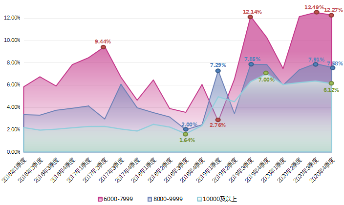 由上图可见,近五年6000-7999元/月、8000-9999元/月和10000及以上元/月较高薪酬区间曲线轨迹波动较大,在2020年第一季度均处于当年低位,之后各季度呈现不同程度的波动。2020年第四季度广西人才网中6000-7999元/月区间的职位数量占比为12.27%,环比微降0.22个百分点;8000-9999元/月区间的职位数量占比为7.58%,环比微跌0.33个百分点;10000及以上元/月区间的职位占比波动不大,占比为6.12%,环比微跌0.23个百分点。