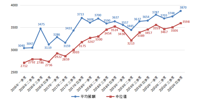 根据广西人才网数据显示,行政/文职/后勤类职位整体呈现增长态势,2020年第四季度平均薪酬为3870元/月,达历史新高,环比增长3.26%。其中,中位值为3598元/月,环比增长2.61%。