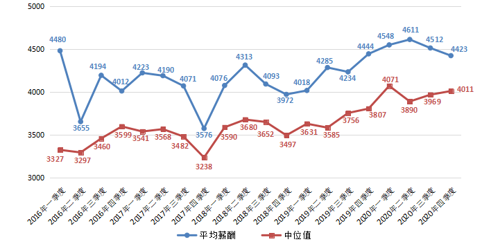 人力资源/人事类职位平均薪酬2020年第二季度平均薪酬达近年峰值,为4611元/月,但在2020年第四季度回落至4423元/月,环比下滑1.97%。其中,中位值为4011元/月,环比增长1.05%。