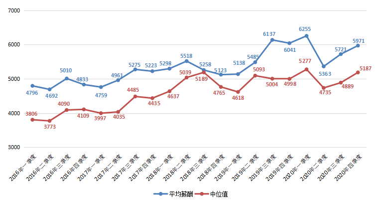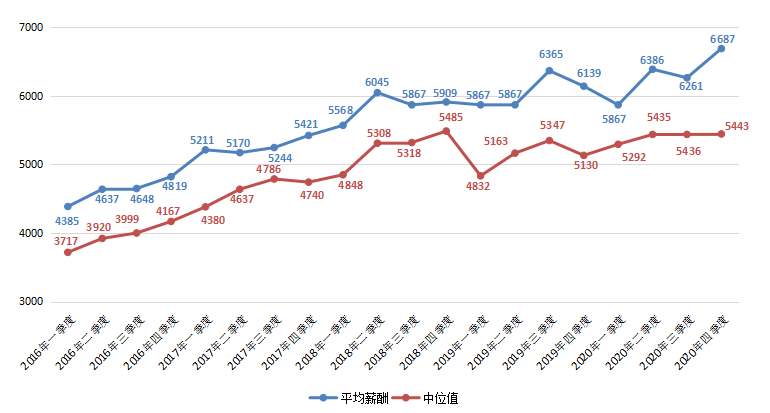 财务/税务/审计/统计类职位平均薪酬在2020年第四季度平均薪酬为4689元/月,环比微降1.01%。其中,中位值为4188元/月,环比增长2.02%。
