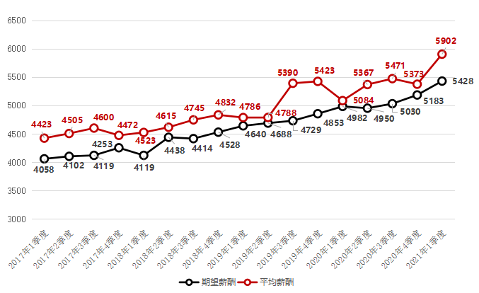 2021年第一季度广西人才网中用人单位发布职位的平均薪酬水平再创历史新高,逼近6000元/月水平,并由此带动求职者期望不断提升。