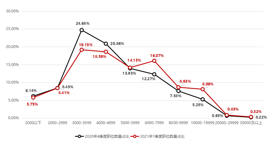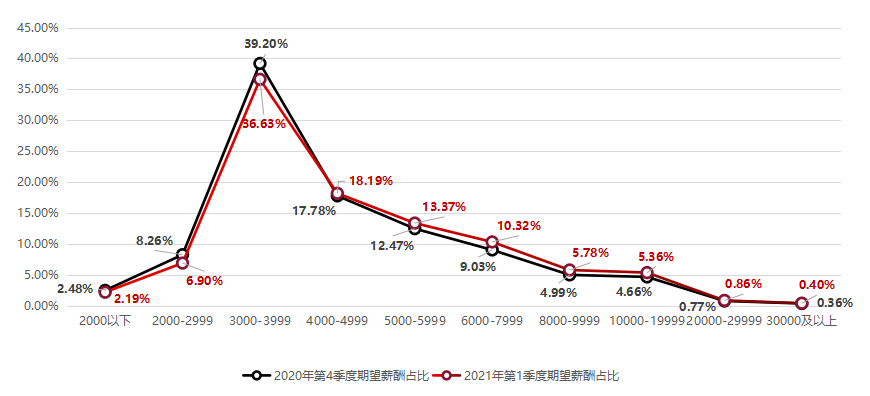 2021年第一季度求职者期望与职位薪酬(各薪酬区间分布)对比曲线图: