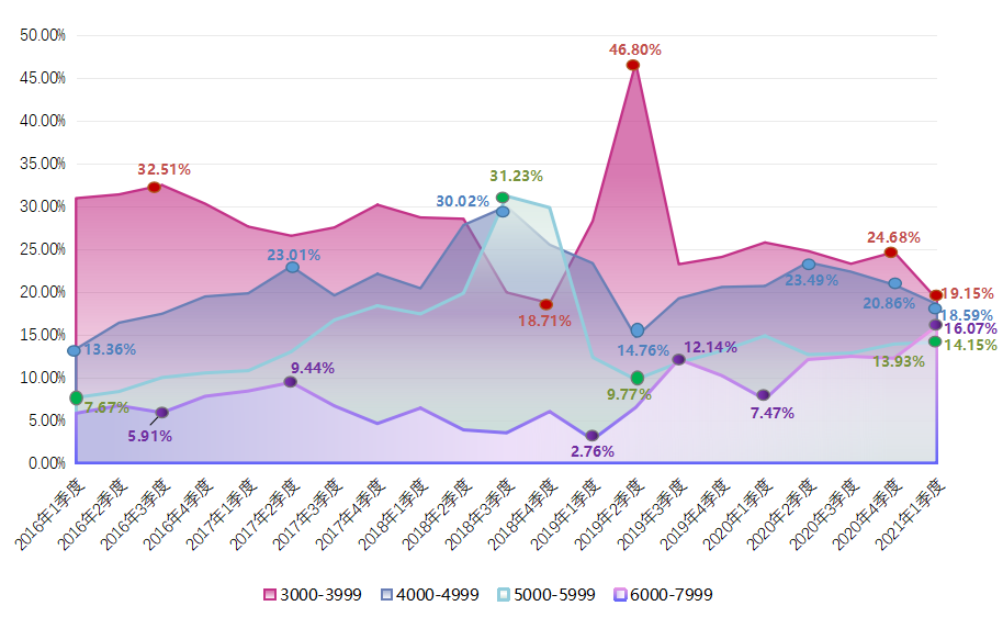 上个季度职位薪酬区间占比仍主要集中在3000-3999元/月和4000-4999元/月这两个区间,占比分别达到24.68%和20.86%。而进入2021年一季度,这两个区间职位占比出现不同程度下滑,3000-3999元/月薪酬区间职位占比为19.15%,环比下降5.53个百分点;4000-4999元/月区间薪酬的职位占比为18.59%,环比下降2.27个百分点;而6000-7999元/月区间异军突起,职位占比达到16.07%,环比上升3.8个百分点。总体而言6000-19999元/月区间职位比重增加明显,主流薪酬区间职位占比有前移趋势。