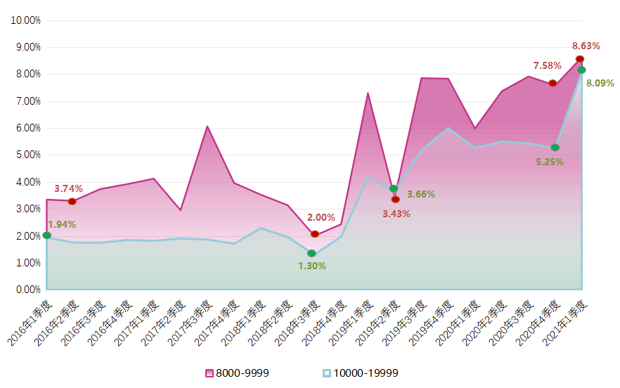 证券/期货/投资管理/服务类职位平均薪酬出现突破性增长,其薪酬水平从往年7000元/月平台提升至近万元/月水平,其平均薪酬由2020年第四季度的7730元/月增至本季度的9906元/月,环比涨幅达到28.16%,与去年同期相比增幅也达到29.00%。