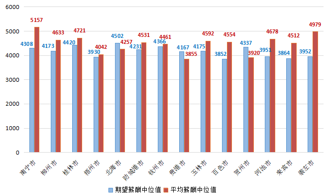 广西人才网中区内主要工作地对应的求职者期望薪酬中位值和职位平均薪酬中位值水平分布图如下(单位:元/月):