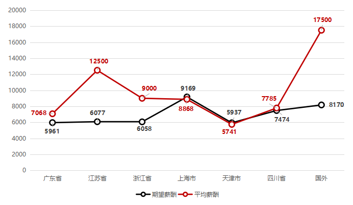 广西人才网中区外主要工作地对应的求职者期望薪酬和职位平均薪酬水平分布图如下(单位:元/月):